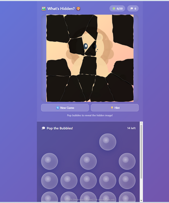 Features: ✨ 5 Random Animals - Cat, Dog, Panda, Lion, or Tiger 🎯 20 Puzzle Pieces to reveal 💭 25 Bubbles (20 poppable + 5 surprise locks) 🎨 Beautiful animations and particle effects 📱 Works on mobile and desktop ⏱️ Track your time and moves